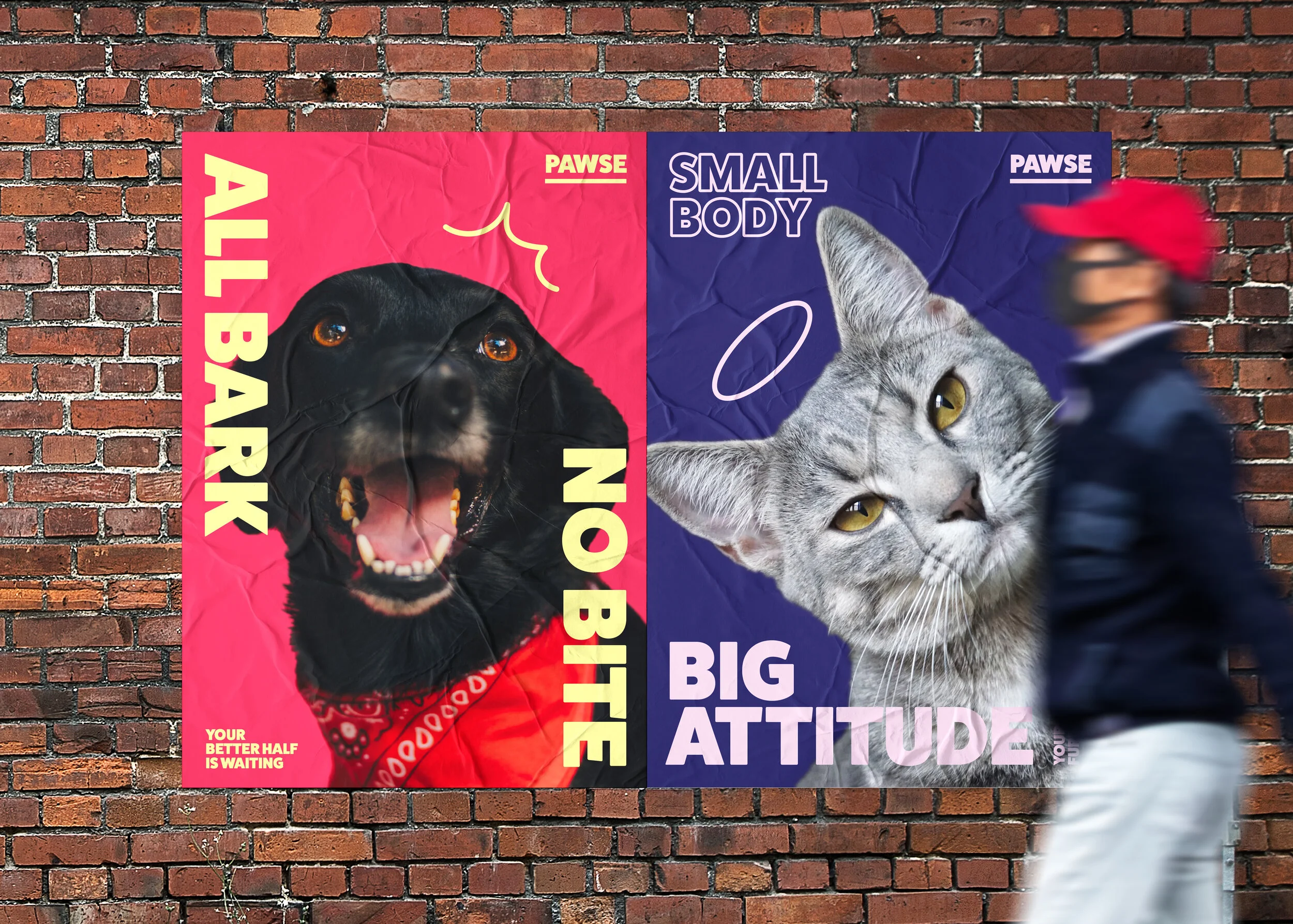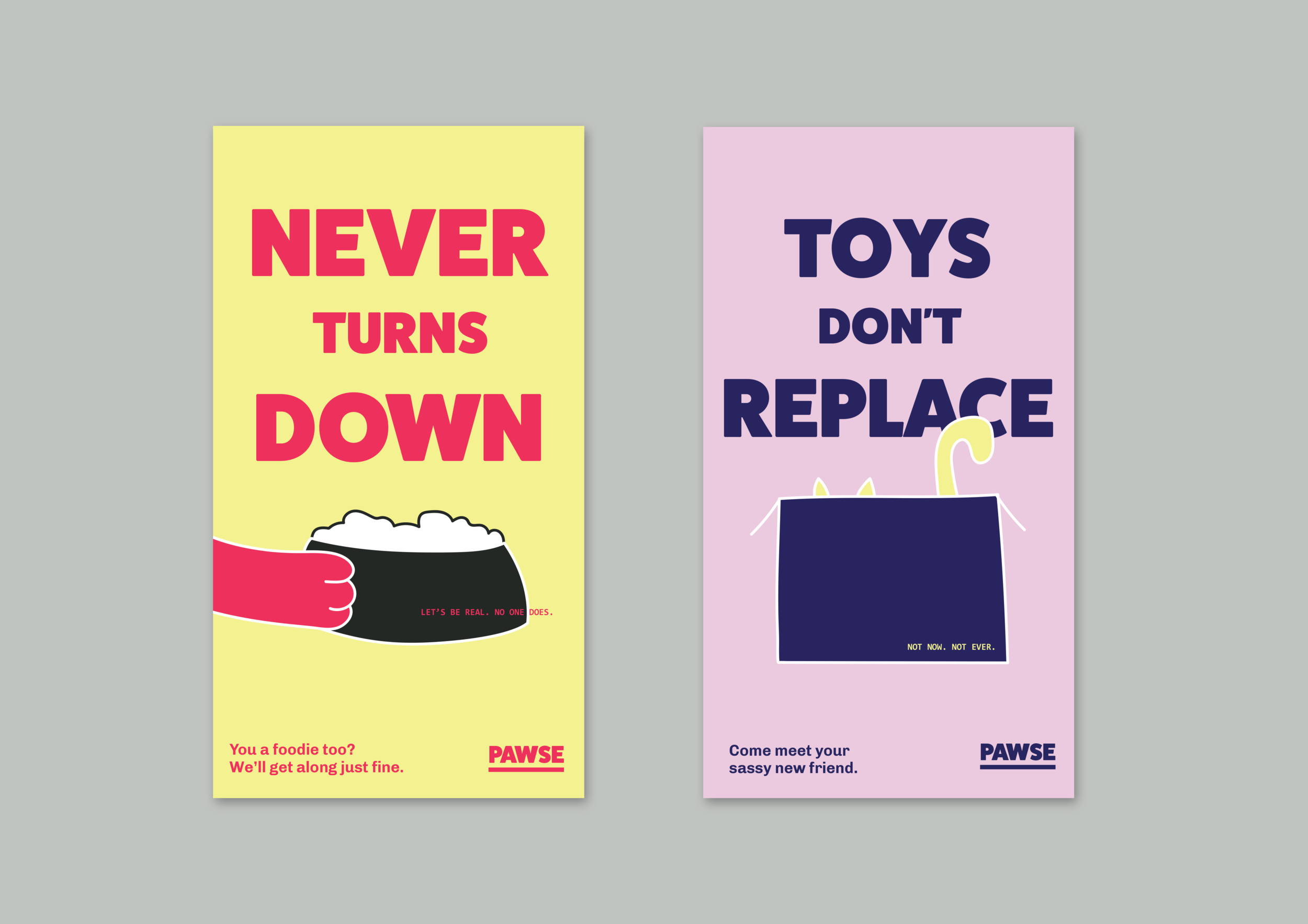 The Pawse Brand Identity ended up with dynamic and fun copywriting, coupled with bright colours and a playful aesthetic to entertain and catch the viewer’s attention. Vector illustrations were added to allow the viewer to relate through personal and/or potential experiences with their own pets and the joys of having a furry companion.